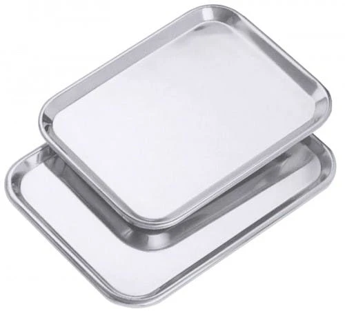 2x Ausstelltablett aus Edelstahl 18/10. hochglänzend poliert. mit offen gebördeltem Rand. schwere Qualität Länge außen: 30.5 cm. Breite außen: 23 cm. Höhe: 1 cm
