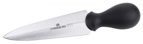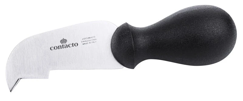 Parmesanmesser Sichelform zum Einkerben und Ausschaben des Käselaibs, einschneidige Klinge aus X65CrMoV15-Stahl, seidenmatt poliert, mit schwarzem hochdichten Griff aus Polyethylen, extra schwere Qualität