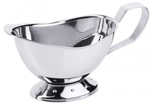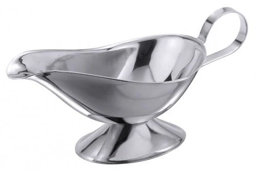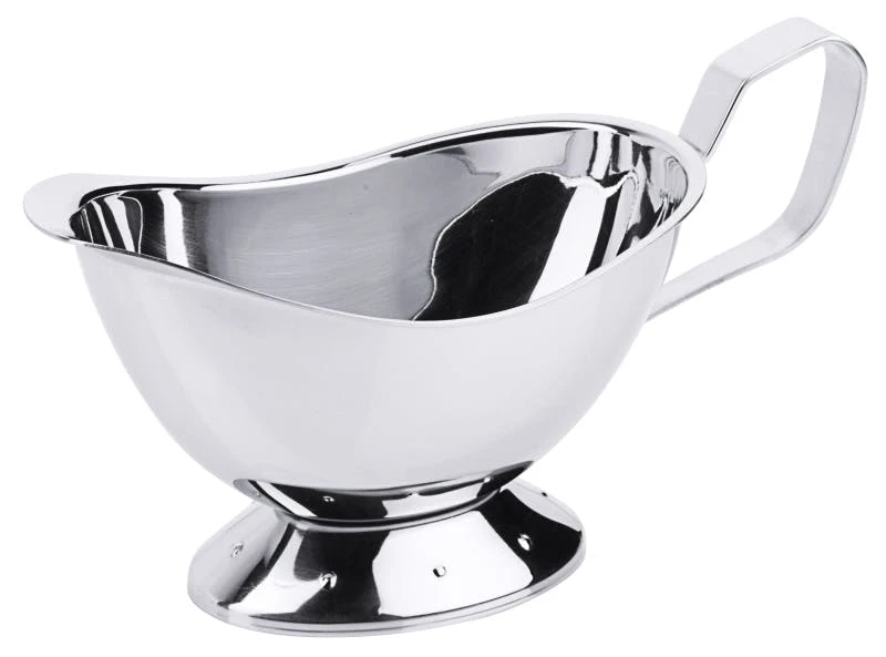 5x Sauciere mit Fuß aus Edelstahl , hochglänzend, mittelschwere Qualität Gesamthöhe: 10 cm, Volumen: 0,25 l, Länge: 22 cm