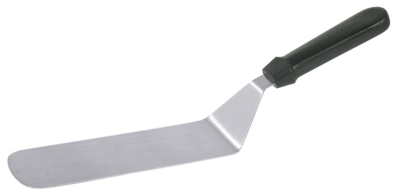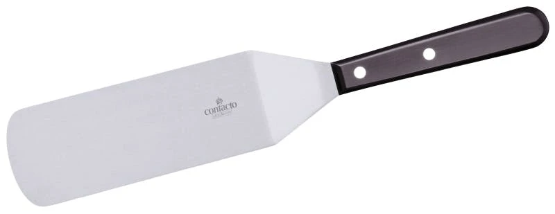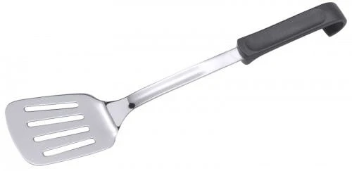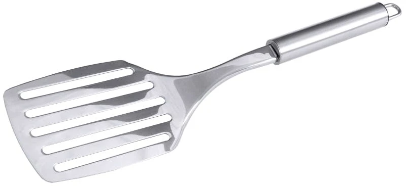 Bratenwender, perforiert, aus starrem Edelstahl 18/0, seidenmatt poliert, mit Griff aus weißem Polypropylen, 7 mm Lochung, stark angewinkeltes Blatt