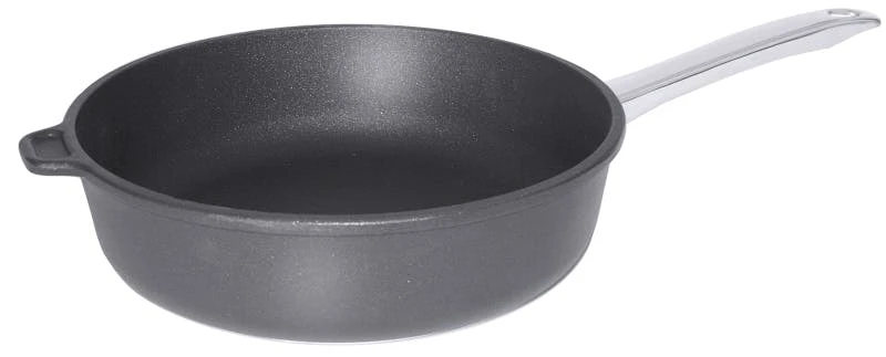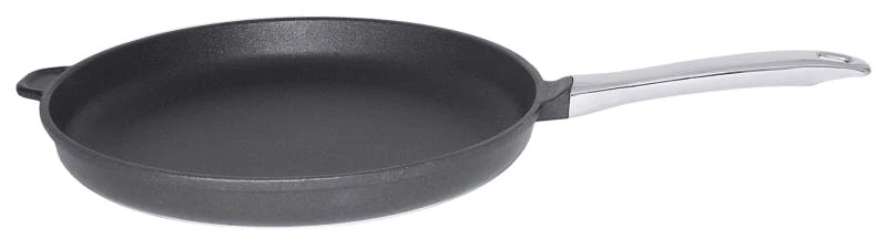 Bratpfanne, flache Form, aus handgegossenem Aluminium-Kokillenguss, Antihaftbeschichtung aus Titan-Aluminiumoxyd-Plasma, backofenfest bis +250°C, mit Stiel aus Edelstahl 18/10, nicht induktionsgeeignet, hochwertiges Qualitätsprodukt