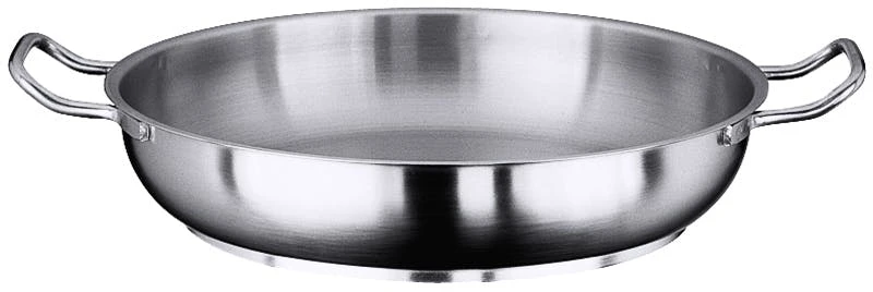 Bratpfanne / Paellapfanne, aus Edelstahl 18/10, matt poliert, mit zwei seitlichen Kaltgriffen und Schüttrand, 7 mm Sandwichboden, induktionsgeeignet (bis Ø 40 cm), schwere Qualität