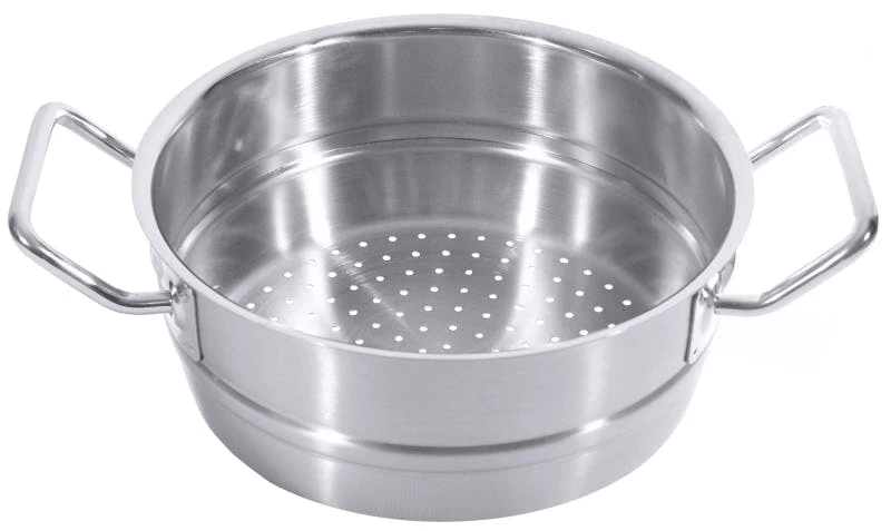Dampfgar-Einsatz, aus Edelstahl 18/10, matt gebürstet mit hochglänzendem Rand, mit verstärkten Kaltgriffen, mit 3 mm Bodenlochung, schwere Qualität