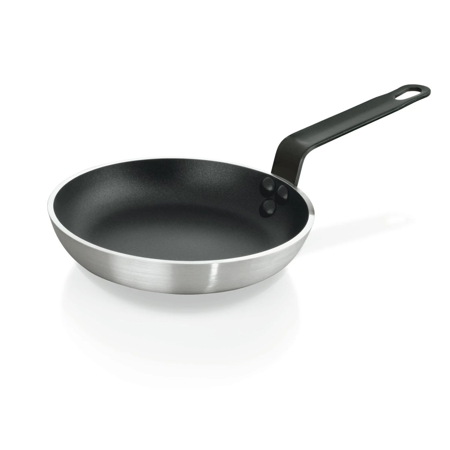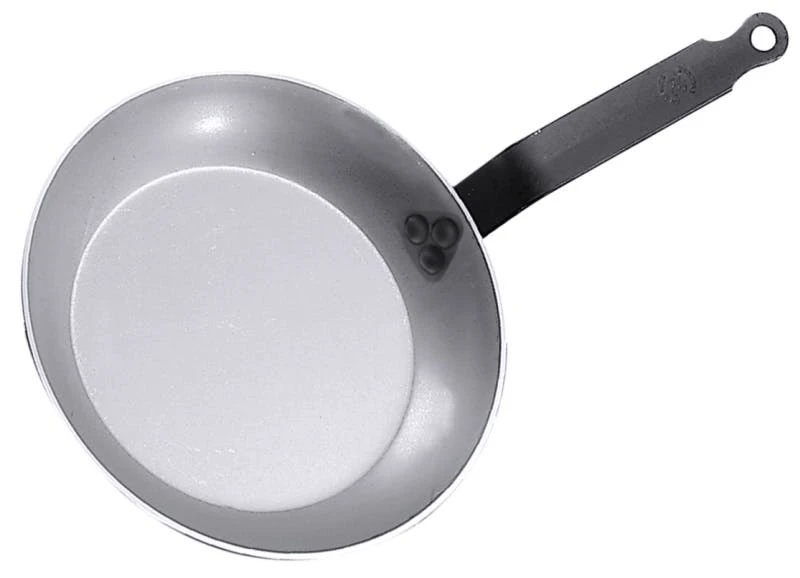 Eisen-Lyoneser Pfanne, aus 2,5 bis 3 mm starkem ungeschwärzten Stahl, gebläuter Flachgriff mit Aufhängeöse, induktionsgeeignet, schwere Qualität