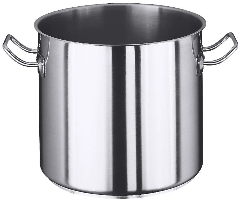 Kochtopf, hoch, aus Edelstahl 18/10, matt poliert, mit Kaltgriffen und Schüttrand, 7 mm Sandwichboden, induktionsgeeignet bis einschließlich Ø 50 cm, schwere Qualität