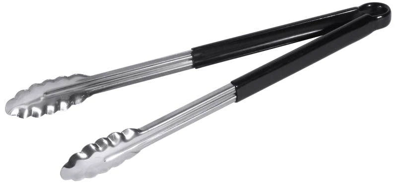 Küchenzange, aus 0,8 mm starkem Edelstahl, hochglänzend, mit Feder und Verschlussschieber, dekorative Greiferform, mittelschwere Qualität