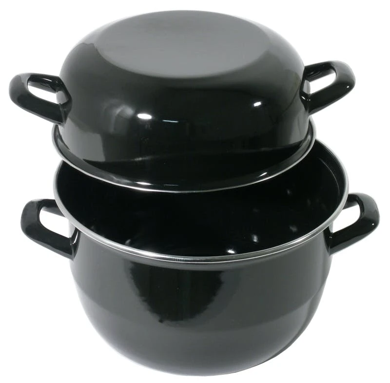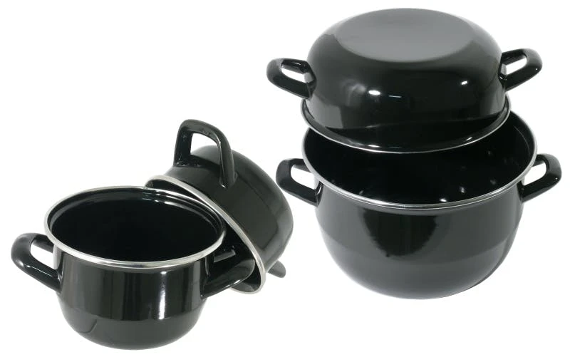Muschelserviertopf für ca. 1 kg Muscheln, innen und außen schwarz emailliert, mit Edelstahl-Ring an Topf und Deckel