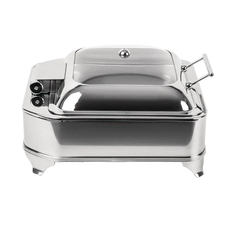 Roll Top Chafing Dish GN 1/1 mit regulierbarer elektr. Heizquelle (Art.7099/002), aus Edelstahl, hochglänzend, mit vergoldetem Griff, ausgestattet mit einem 65 mm tiefen GN 1/1 Behälter und zwei Brennbehältern, Deckel bleibt in jedem Winkel selbständig geöffnet, schwere Qualität