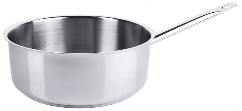 Stielkasserolle, extra niedrig, aus Edelstahl 18/10, hochglänzend, mit Rohrgriff und Schüttrand, 8 mm Sandwichboden, induktionsgeeignet, schwere Qualität
