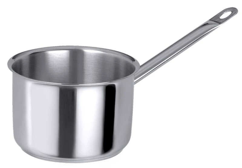 Stielkasserolle, mittelhoch, Sautoirform, aus Edelstahl 18/10, hochglänzend, mit Rohrgriff und Schüttrand, 8 mm Sandwichboden, induktionsgeeignet, schwere Qualität