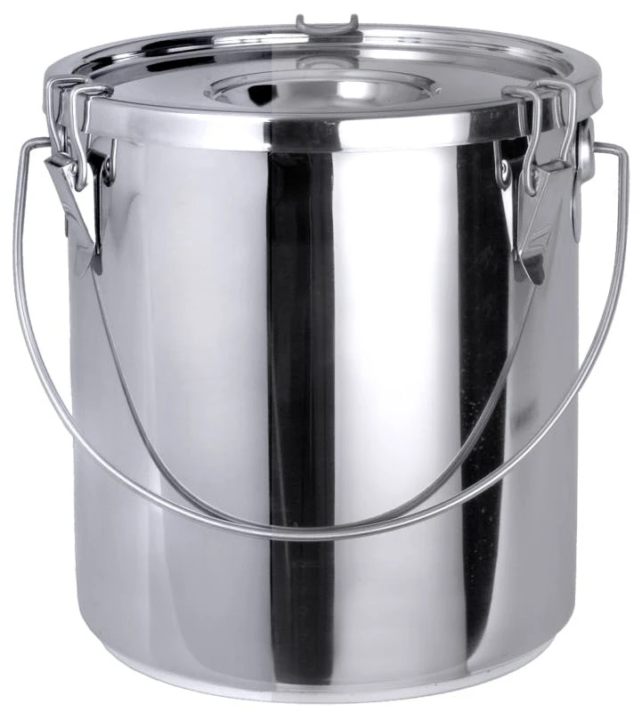 Transporteimer, aus Edelstahl 18/10, hochglänzend, mit Deckel, Dichtungsring aus Silikon, mit drei Spannverschlüssen, eventueller Über-/Unterdruck lässt sich durch Ventil im Deckel aufheben, schwere Qualität
